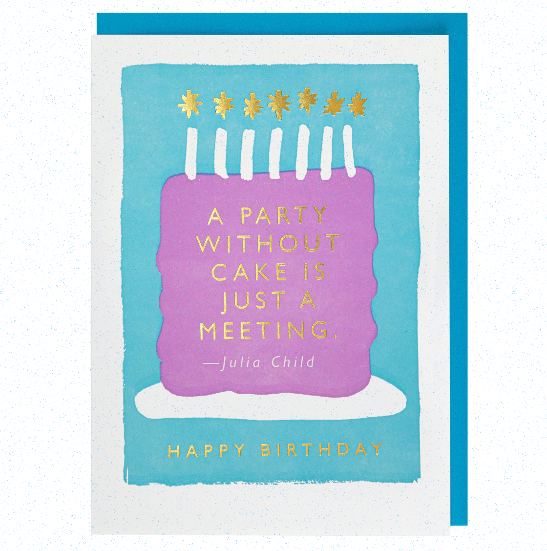 Vores letterpress-hilsenskort med en lilla fødselsdagskage med syv guldfolielys og ordene "en fest uden kage er bare et møde - Julia Child. Tillykke med fødselsdagen." Designet af J.Falkner Vores letterpress-hilsenskort er store, dristige – og stolte af det. Disse kort kombinerer ofte vittige ord med vores farverige blæk og er designet til at skabe et statement og fremkalde smil i det øjeblik, de falder gennem postsprækken.